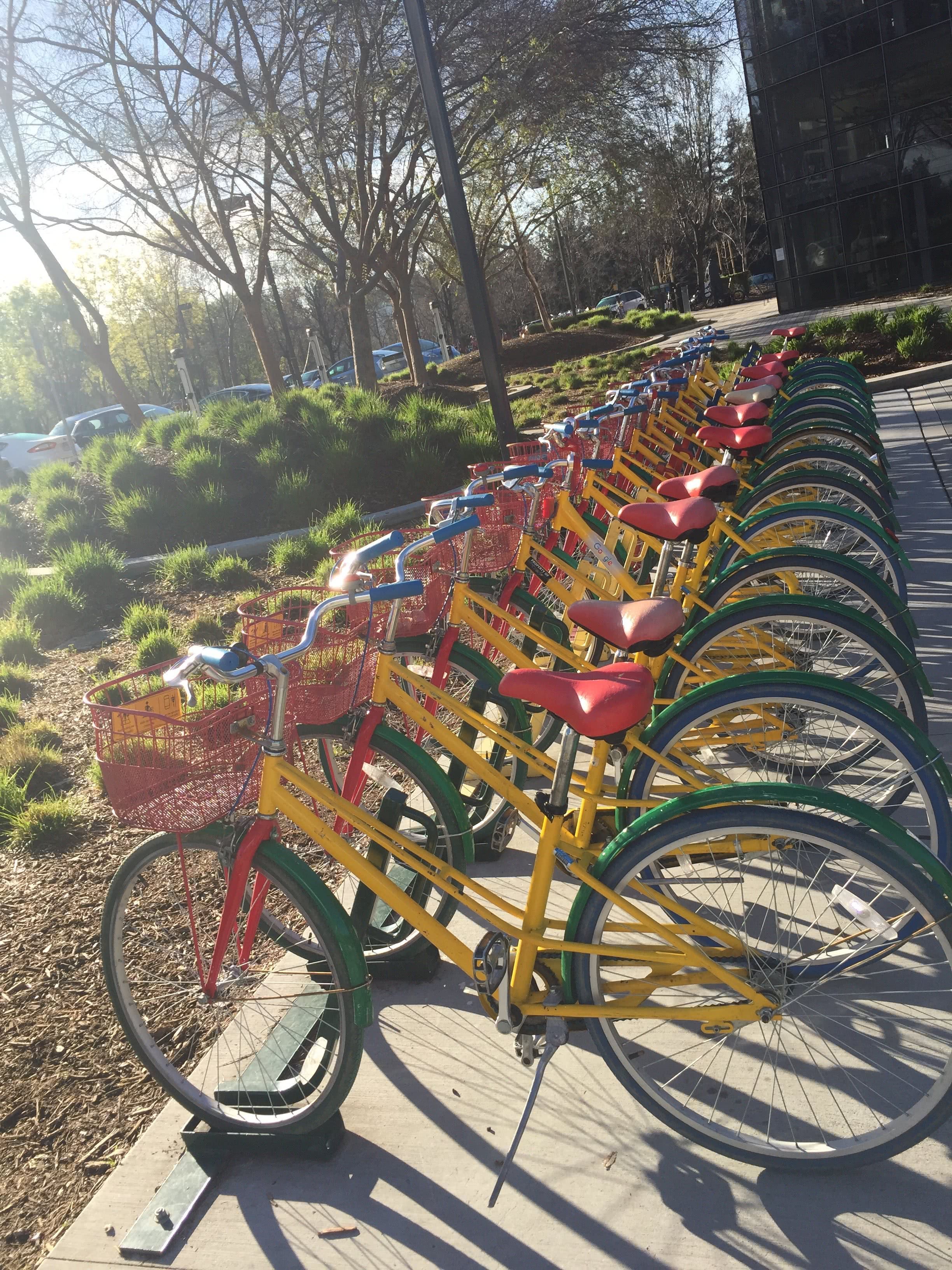 Mit unserem Kaffee in der Hand und bei herrlichem Sonnenschein beobachteten wir die ankommenden Google-Mitarbeiter. Eines wurde sofort offensichtlich: Die haben Spaß und Lust auf ihren Job und sehen einen Sinn in ihrer Arbeit. Sie sahen für uns eher wie eine Gruppe von Leuten aus, die zu einem Konzert oder Sportevent pilgern und sich auf etwas Großartiges freuen. Äußerlich gesehen war ihr kleinster gemeinsamer Nenner der Google Badge, ansonsten sah man da eine bunte Vielfalt an Charakteren, Typen, Hautfarben und Styles. Genau so bunt wie die Google Fahrräder, die man an jeder Ecke sieht. Und: Fitness rules! Die Hälfte kam im Sportdress, machte gerade Sport oder war auf dem Weg zum Sport.